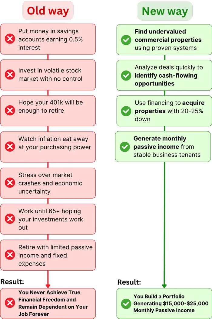 The Commercial Real Estate Investment System stands out because it's specifically designed for busy professionals, not full-time investors. While other courses focus on complex strategies or require extensive time commitments, our system teaches you how to build wealth while keeping your day job. We focus on cash-flowing properties in your local market rather than chasing hot markets across the country. Our approach emphasizes conservative analysis, proven financing strategies, and systematic processes that work for people with limited time. Most importantly, we teach commercial real estate, which offers better returns, more stable tenants, and less competition than residential investing. This isn't about getting rich quick - it's about building sustainable passive income through proven strategies.