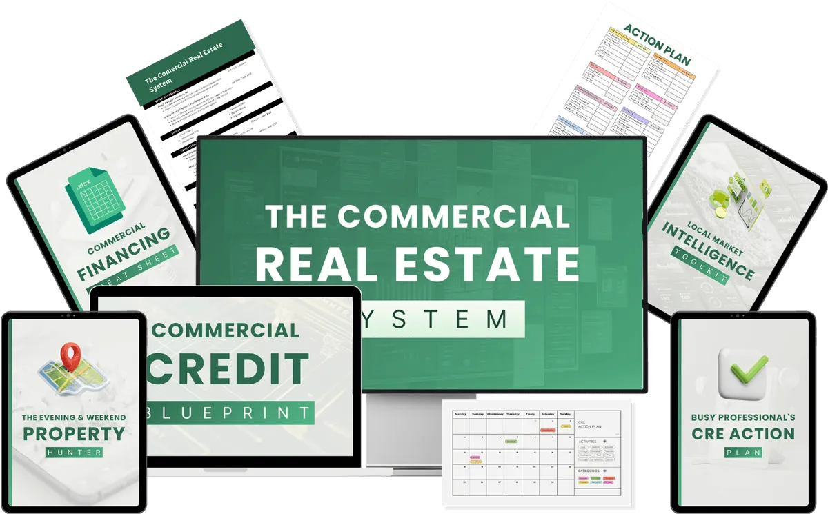 When you purchase the Commercial Real Estate Investment System, you're getting a comprehensive training program that teaches you everything needed to find, analyze, finance, and acquire commercial properties. The system includes step-by-step video training covering market analysis, deal sourcing, financial evaluation, financing strategies, due diligence, and property management. You'll also receive 5 valuable bonuses: The Busy Professional's Action Plan, Commercial Credit Blueprint, Financing Cheat Sheet, Evening & Weekend Property Hunter guide, and Local Market Intelligence Toolkit. Everything is designed specifically for working professionals who want to build passive income without becoming full-time investors. Plus, you get lifetime access and a 30-day money-back guarantee.
